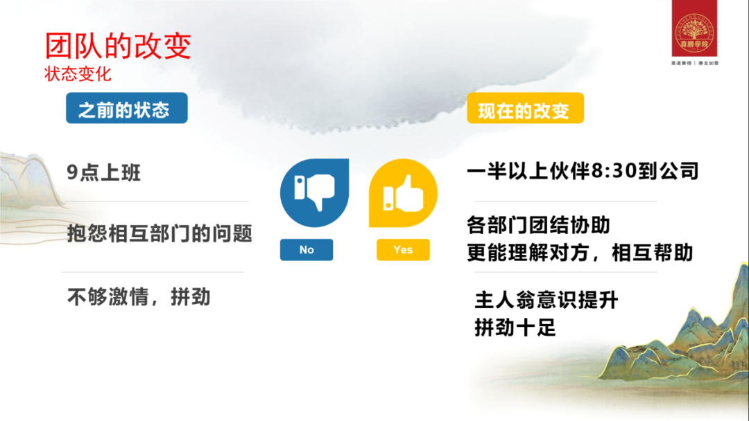 所以在这个版块,我也跟供应商讲到要正规经营,要提供发票给我们。现在我们是在做货前付款,收货前付清全款,所有的账单都是提早去完成,开票完全都没有压力。特别是现在我们跟供应商的关系是到了一个月开500万的发票都没有压力。所以这种配合度上有我的改变,还有供应商配合度高,效率都提升了,而且把供应链都夯实了。然后团队的变化,以前我们有九点钟上班,然后大家可能都踩点上班,就九点钟急急忙忙跑到公司,而且偶尔会有抱怨采购部门、供应链,这是外贸企业的通病。以前不够激情、冲劲等等,这都是我们以前不足的地方。现在的话,有一半以上的小伙伴8:30就到公司了,非常地团结协助,主人翁意识很高,像我们中午的食堂,他们会愿意自己去刷地板、刷墙,我们本来是请外面的人来弄,但是他们说不用,自从大家学了阿米巴,都想着怎么为公司省钱。我想说大事做不做得好,就看这些小事,细节这么小的事他都愿意为公司担当和成长,所以我很信赖我的员工,也很感谢他们那么信任我。