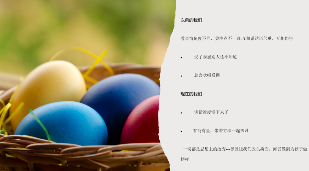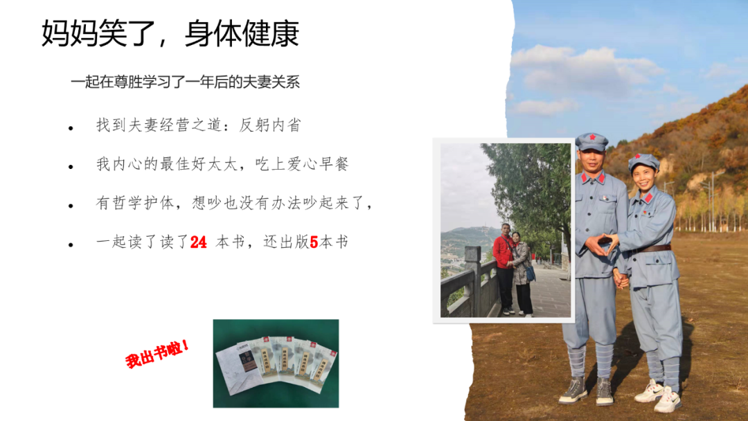 我们一起在尊胜的这一年,学到了第一个夫妻经营之道—反躬内省。我们以前都是向外看,都是你要怎么着?我要改变你,你不行,你这个不对。现在改成我要怎样?所有的问题用夫妻经营之道解决了,她现在是我内心的最佳好太太。有一天早晨,我发了一碗面条到群里,做了很大一碗,我想表达的意思是做得太多了。潘师兄(尊胜四期学员潘爱琴师兄)马上说“一早晨就撒狗粮。”然后我当时在想:“这明明是一碗面条,怎么变成狗粮了呢?”有了哲学护体,我们吵不起来了,比如说刚有矛盾的时候,刚要起冲突的时候,我只有两句话就可以了,就不会吵架了。怎么说呢?第一,你的哲学白学了吗?全是都放在嘴上说说而已吗?不去做的吗?第二,要拿方法来说,不要拿语气来压我。说完这两句话就会解决。这一年,我们一起读了24本书,还出了5本书。我从来没想过我还会出书,