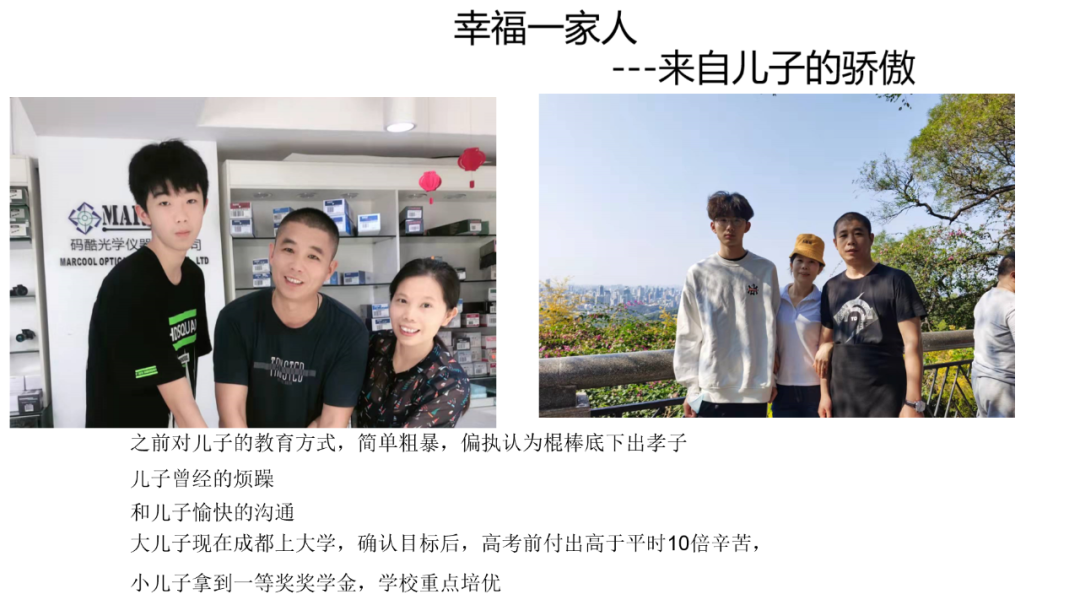 下面是来自儿子的骄傲。以前,我对儿子就是用那种简单粗暴的教育方式。北方人嘛,我老爸是这样教我的,也是这样教育我的;不行就打呗,只有打了、怕了,他就老实了。这就是以前的教育方式。儿子也是很烦恼,因为我们在家里吵吵闹闹,太影响他学习。他觉得“你们太烦了,你们太吵了。“他也给我们发过这种牢骚。现在呢,我放下父亲的姿态,跟儿子好好去沟通,跟做朋友一样的去沟通。在考大学之前,他确立了目标,能够看得出来他付出的努力比以前多十倍百倍。后来跟他聊天说:“为什么当时不辛苦呢?”那时候他很痛苦,他自己说:“哎呀,我也困了,我也坚持不住了。”我鼓励他:“没问题的。”他确实不错,现在在成都上大学。现在老二是初中升高中,今年他拿到了学校的一等奖奖学金,而且还是学校的重点培优。