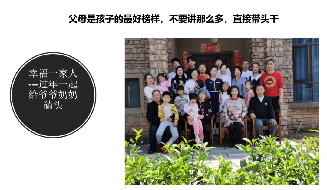 我们在孩子面前不用说,做就行了。春节时期老家有个习俗,爸爸带着我们去给爷爷磕头。到了广东之后,很久都没有延续这个礼数。我们的孩子出生之后,没有做过给爷爷或者长辈磕头的事情。在学院学习了孝道,2021年春节的时候,第一步今年一定要回家给长辈磕头;我当时还在想,这俩儿子这么高,我干这事,他们不一定干啊。但是我当时是想错了,也多余了,我们磕完了之后,起来之后,人家就说“上”,马上就磕完了,没有多说一句话的。所以你只要干就行了,不要说那么多。