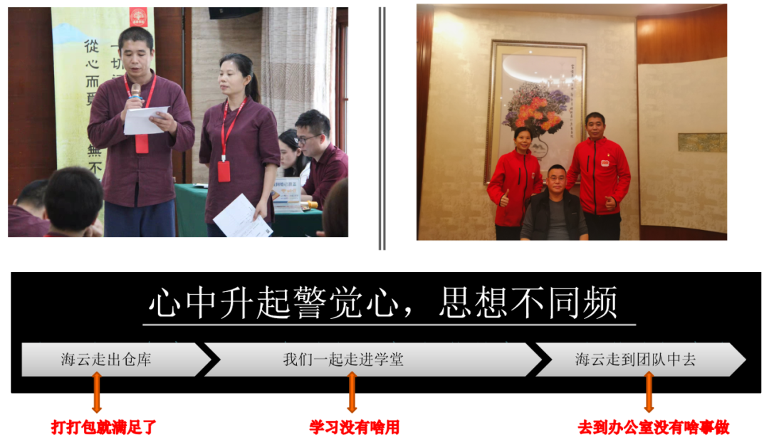 又有三个关键词,第一,“高龄”,70岁了;第二,“创新”,不断有新菜出来;第三,打开了手机学习。所以说学习什么时候都不晚,我们一起走进了学堂。以前,我跟海云说:“我们一起去学吧!”她说:“不去的,没用的。”按照她看到的是没什么用的,因为我们以前去学的,学完之后回到公司有可能会分享一下,之后就没动作了,没声音了,啥也没了。我们来到这里,课堂上学的,需要在企业中落到实处,真修实干。第三个是海云走到了团队中,刚开始她说:“我就是办公室里好像没啥什么事情做,我不知道干什么。”大家都在忙,没人理。后来融入之后,用自己丰富的经验帮助团队优化了接待大客户业务经验。我们今年做了一个改变——把思想同频。还有“付出不亚于任何人的努力”,这是一定要做的!梦想不是说说就能实现,你躺在被窝里,那只是做梦,实现不了梦想。有一天晚上,她回来跟我讲,她说:“我今天坐地铁又坐过头了,晚上回到家里又将近9点钟了,好辛苦,好累。”我一看坏了,又要搞不成了,又想不干了。