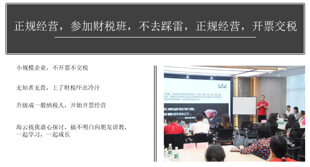 接下来看我们第一年的结果,2021年同比2020年营业额增长率是76.8%。2021年同比2020年的纯利增长率是25.42%,2021年同比2020年毛利率增长率是12.17%。这些数据出来之后,第一个点是我们内耗没了,我们俩不在公司里斗了。又做了几个重点动作——双重确认,看到别人看不到点,把漏洞堵住。第二个点是“率先垂范”,老板要做到前面。第三个点是海云做了加入团队之后,用丰富的销售经验,提升了团队的业务能力。对产品要有敬畏心。我们在产品上是有分歧的。比如说螺丝歪了,我自己认为海云有这个能力说服客人接受,但我说这个不行,歪就歪了,不能接受。今年参加了财税班,正规经营,我们以前都是想着不开票,少交税,不交税。当时都是以小规模的形式去做的,现在通过参加了廖老师(尊胜学院财税专家廖荣晖)的课,发现真的是“无知者无畏”。“同心经营,我们一起向前看。”我们以前的分工是对数字是没有概念的。有人问我你今天做了多少?我说不知道。别人说:“我不是找你借钱。”我说:“你不要怕,但是我真的是不知道。”是没有这种概念。