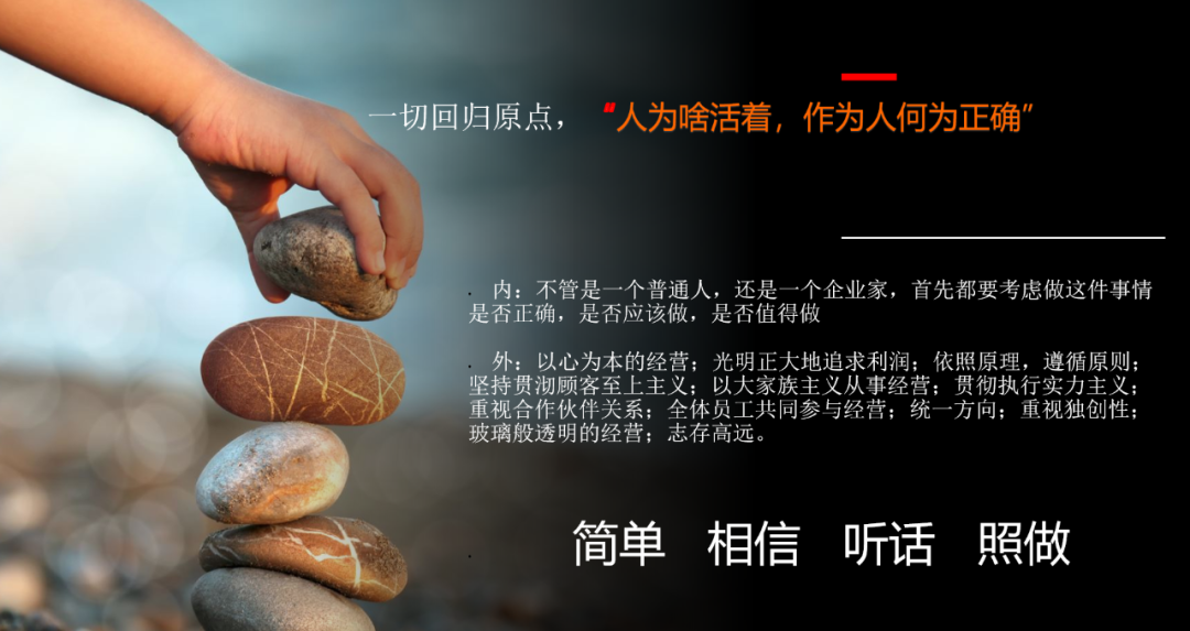 最后做个总结,我本来是想写“人为什么活着,作为人,何为正确。”这个方向太大够不着,只有这八个字就可以了。简单、相信、听话、照做,今年是照着这八个字去做的,明年还是照着这八个字做,我相信一定会越来越好!谢谢!