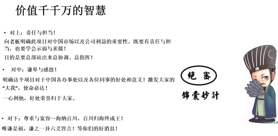 - 第一,向总部示弱,取得总部的协助—呼应老师的对上策略。这是我们广州第1次来主导3个国内办公室团队配合的项目,我们团队非常年轻,从业时间都不长,我们非常的强硬和傲慢直接借了丹麦给我们的授权开始了硬邦邦的指导,结果不管在团队沟通上还是在成本控制上,工作开展的非常不顺利。在和区域老大多次沟通和求援后,他终于答应走了出来做总指挥和协调。在外企,很多项目都是由欧洲人来主导,中国团队拿到主导权是不容易的,大家内心里是非常开心这种项目的自主感的,而总部也是看中广州团队在19年成功独立运营过一个很大的智利项目。但是反省下来我发现我们广州团队有机会成长是归于上海和青岛团队的谦让,他们没有参与,当时才让广州非常幸运有了迅速介入千万项目的机会,最后所有的功成名就都集中到了广州身上。稻盛老先生说 “陶醉于自己的能力或微不足道的成功,骄傲自满,就得不到周围人的帮助,并且妨碍自己的成长。”---这其实是南通项目在我们广州团队最真实的写照。