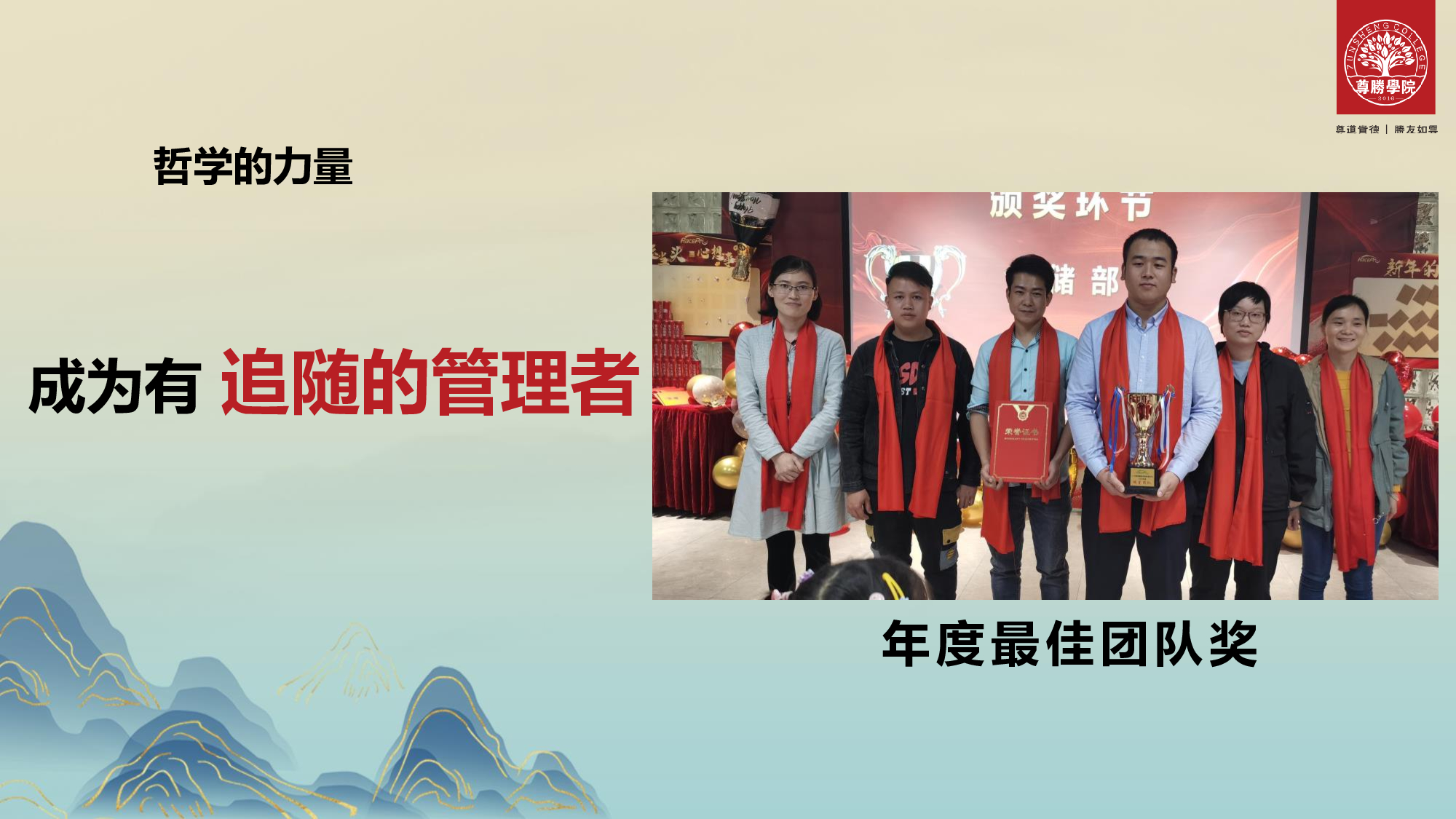 刚进公司的时候,我想成为公司的标杆,年年被评为优秀员工,在2021年年会上我还拿到了公司最高的荣誉,总经理特别奖,刚当上主管的时候,我想成为优秀管理者,在2021年也带领团队拿到了优秀团队奖。2022年五月份跟着尊胜游学方太,我有了更大的梦想,努力5年成为公司合伙人,跟着公司一起发展。
