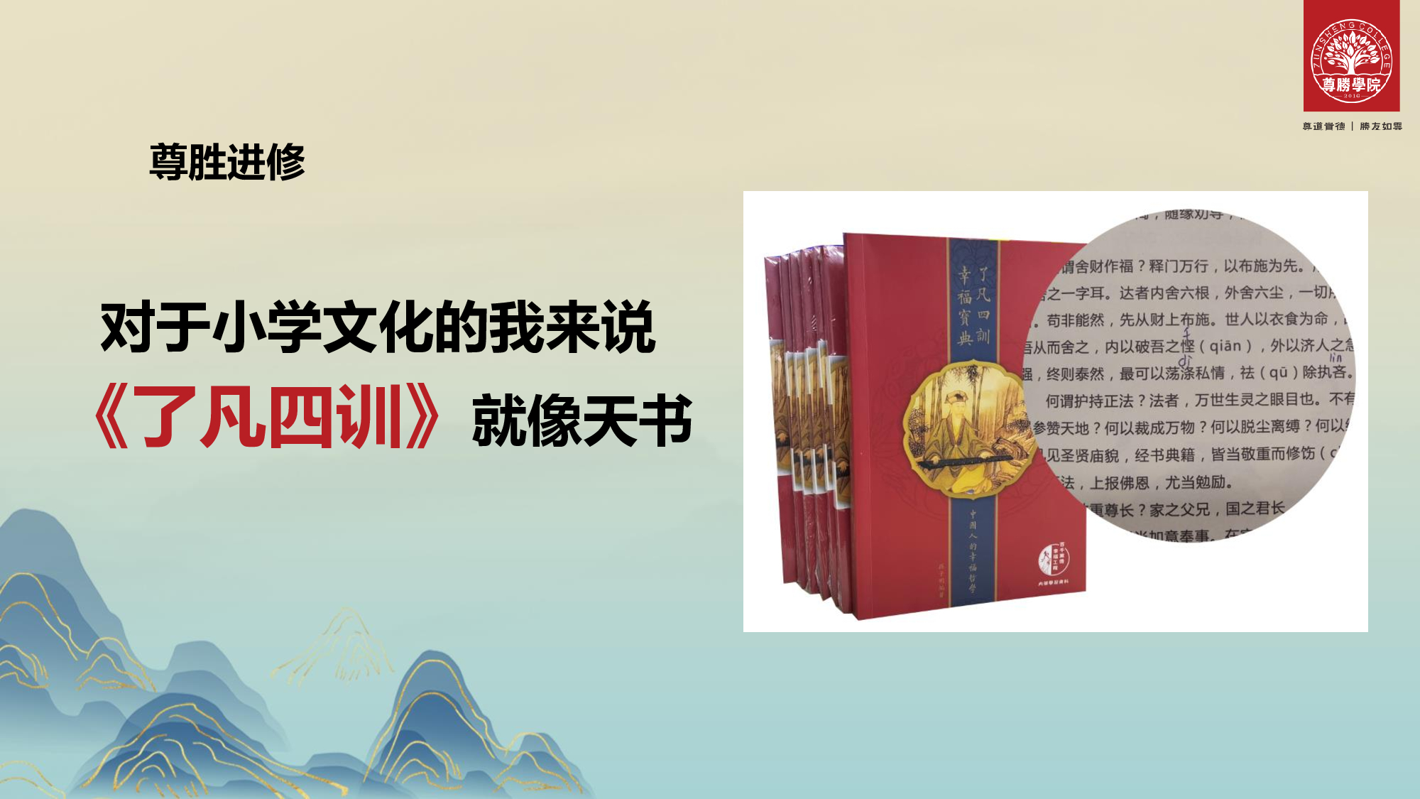 没多久老板就带我来尊胜学院学习,没上课就发了一堆书,翻开书本一看,一堆文言文, 十几年没看书了,小学毕业的我,看到那些字就像看天书一样,很多字都要一个一个去查百度,打卡很敷衍,天天一样,交作业都是从百度上抄,勉勉强强地读了几本书之后,就跟老板说我不想学了,实再学不下去了。