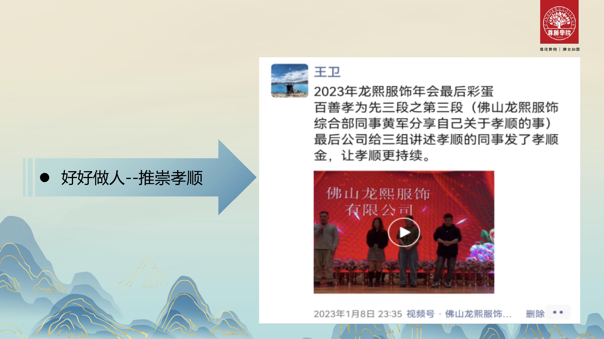 第一个是在公司年会增加员工孝顺事迹讲述。这个事迹讲述引起了很多员工的共鸣,很多员工都说趁着过年回去要给家里人做一些自己该做的事。那天上台的三组同事都是孝顺的代表,同时他们的工作也是做得很出色。我们有理由相信:一个孝顺的人肯定可以对企业负责,把工作做好。