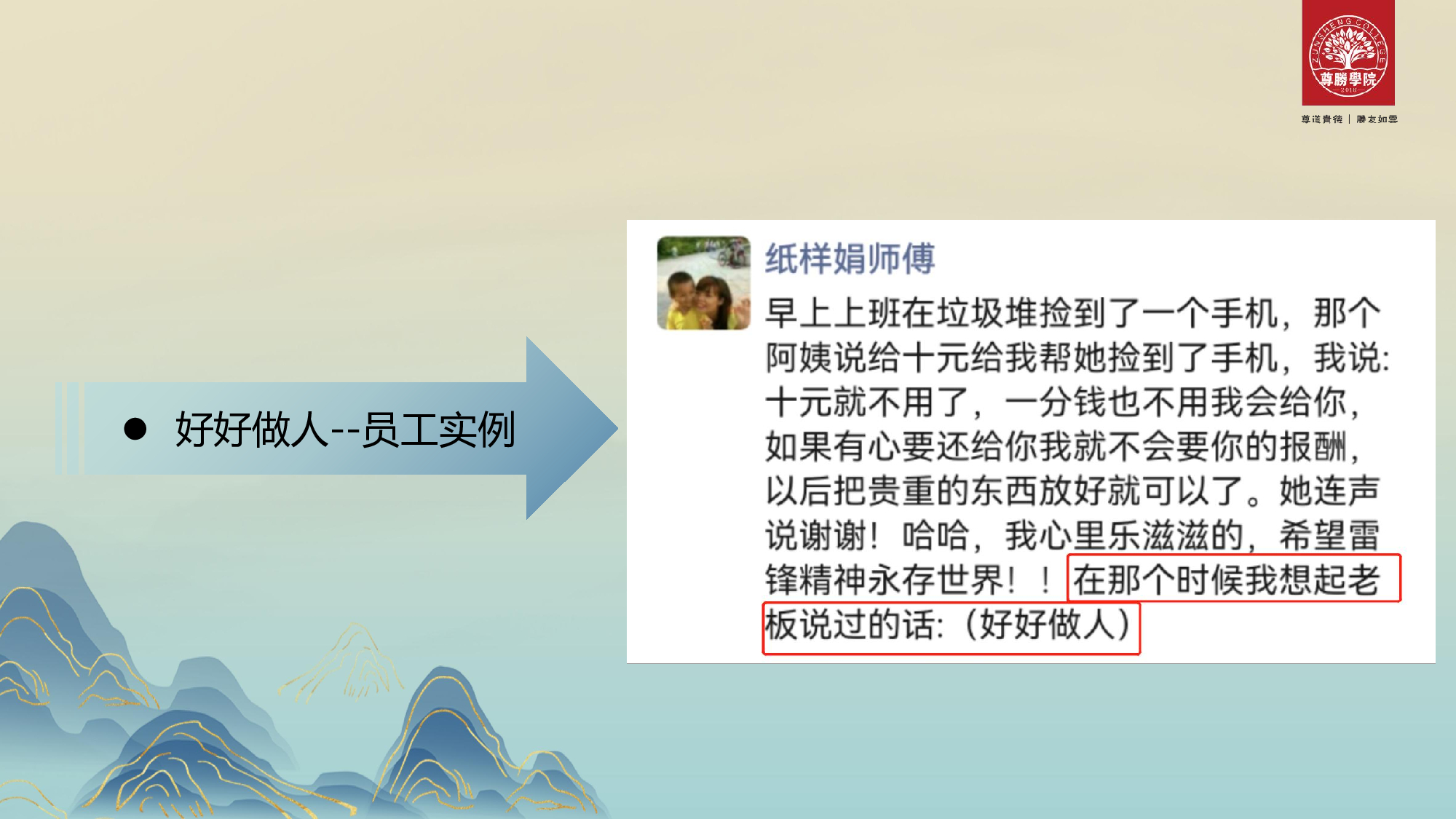 第二个是一位同事捡到了一部手机,经过思想斗争,最后想到我们经常说的:好好做人,她果断的把手机交还给失主。