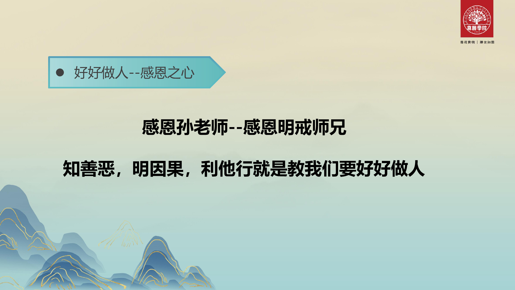 感恩孙老师,尊胜学院教导的明因果·知善恶·利他行,就是教导我们好好做人;感谢带我走进尊胜学院的吴国平(明戒)师兄,也就是我尊敬的WOODY哥。以上就是我修学100天的部分收获,由于时间关系没办法一一讲述,我也期待后面有更多的收获。聆听也是一种美,谢谢大家的聆听。