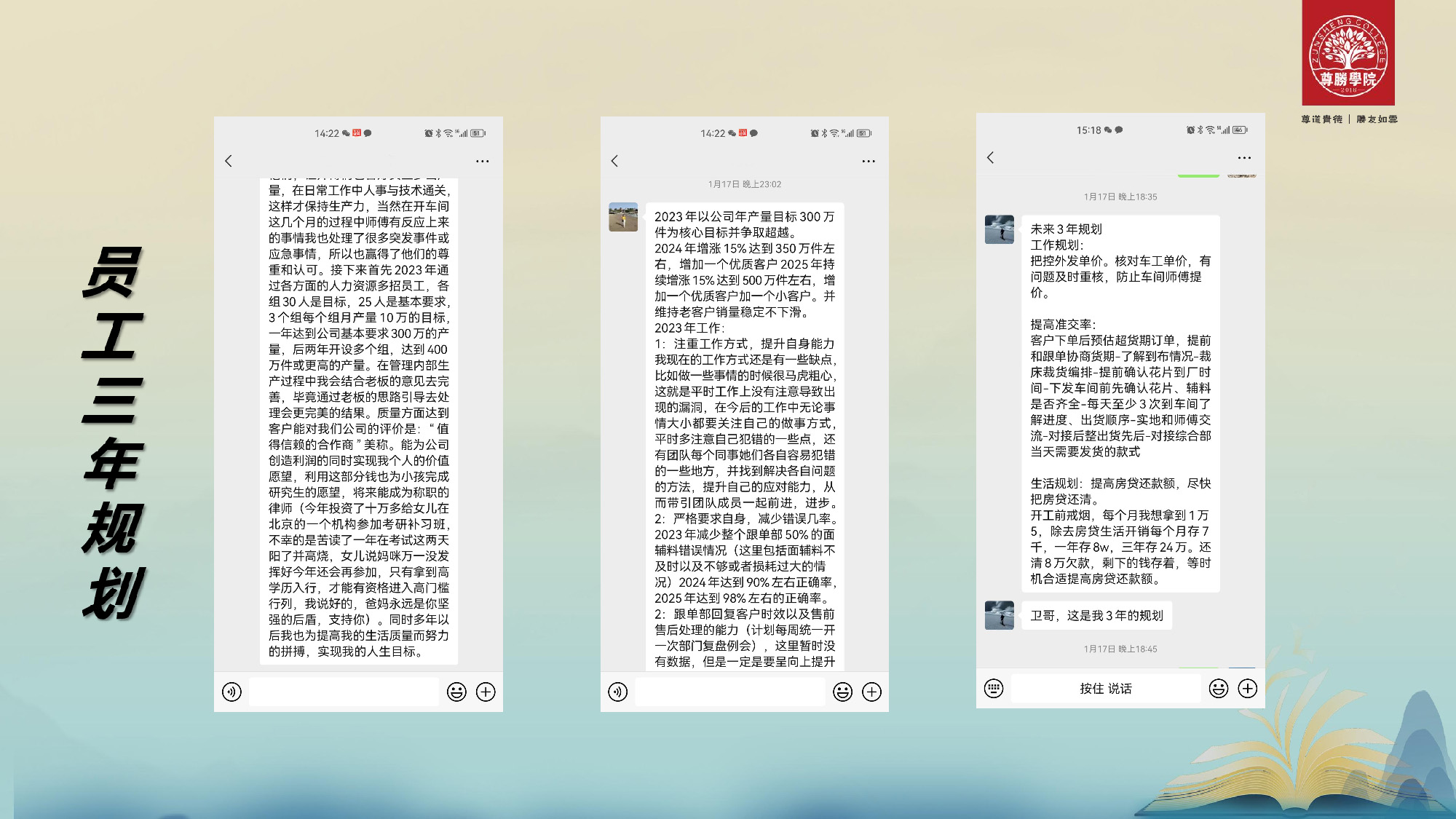今年有一些员工给我写了三年规划,很多人都说要努力跟公司一起实现2023年公司出货300万件成品的目标,有的是说要突破350万件,400万件。从心慌到员工与公司目标共有的背后是我们这一帮人的心在一起,全公司152人的心都在一起,公司会不好吗?