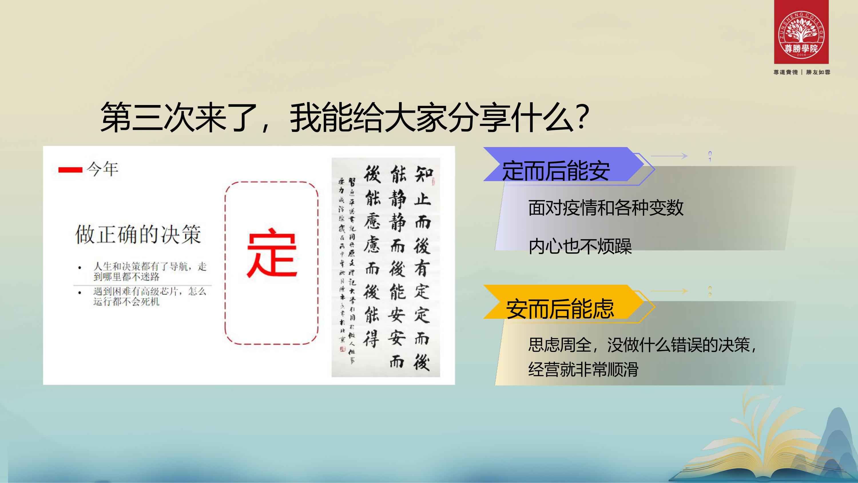 《大学》里有句话“知止而后有定,定而后有静,静而后能安,安而后能虑,虑而后能得。”对于我来说,过去的一年,为什么波澜不惊?在于定,面对什么事情都不是事儿。当我定而后能安的时候,面对疫情面对什么,内心不烦躁,兵来将挡,水来土淹。当我安而后能虑的时候,就会思虑周全,做正确的决策。