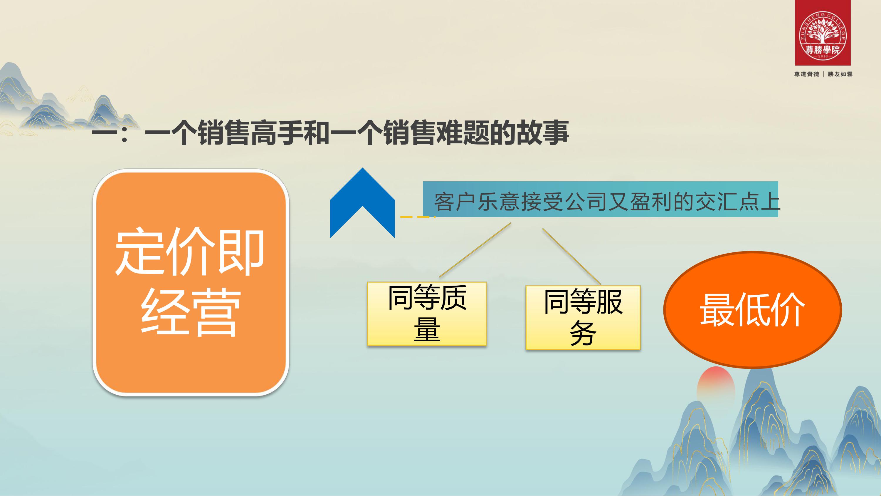 我们在读书的时候,经营十二条里面有一条叫做定价即经营,价格应在客户乐意接受,公司又盈利的交汇点上。客户乐意接受的价格是什么?就是同等质量、同等服务里面的最低价。