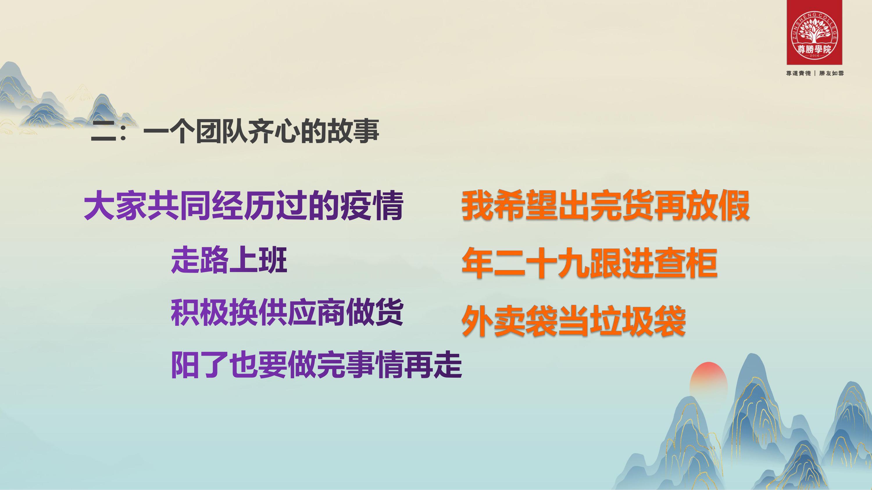 之后我又带着我的四位同事,五个人一起来【尊胜六期】参加学习。现在我们还有一个团队在【尊胜八期】学习,今天在场有我接近十位的同事。2020年开始,虽然很难,但是我还能站在这里,说明一个问题,我挺过来了。