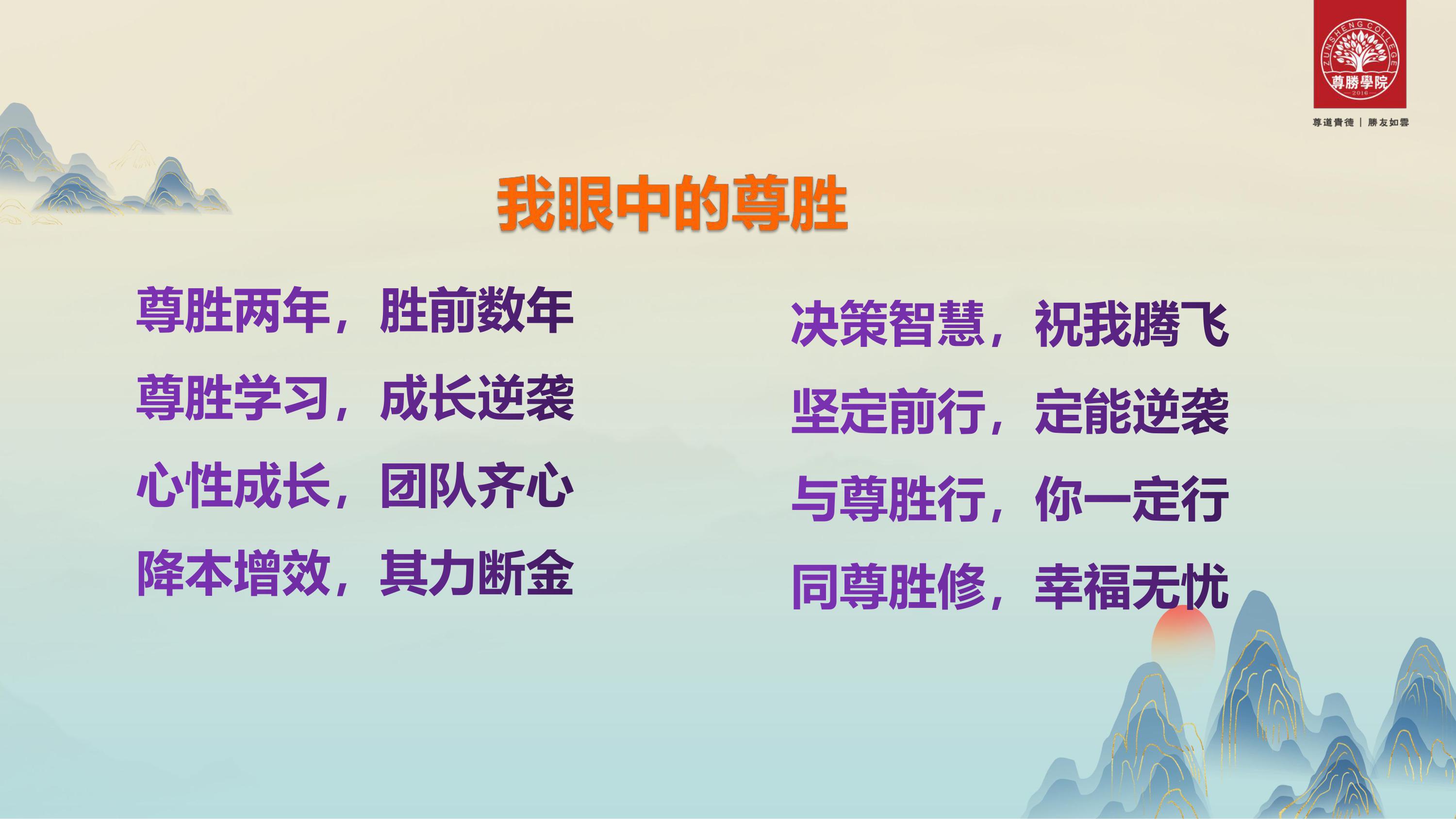 最后分享我眼中的尊胜:学习可以让人成长逆袭,心性成长,团队齐心,降本增效,其利断金,决策智慧,助我腾飞,坚定前行,定能逆袭。与尊胜行,你一定行;同尊胜修,幸福无忧。