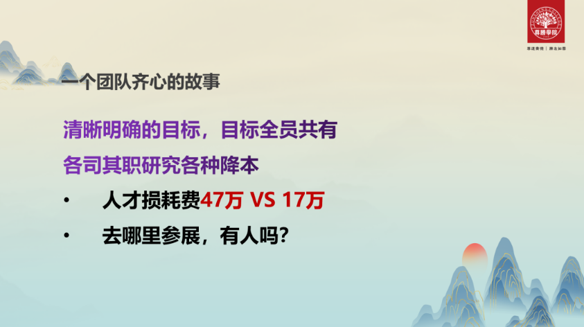 在尊胜学习经营哲学之后,每个部门都有清晰明确的目标,并且全员共有。企业经营就是销售最大化、经费最小化、效率最高化。2020年团队人才损耗费是47万,2022年,团队人才损耗费是17万,省下的每一分钱都是净利润。